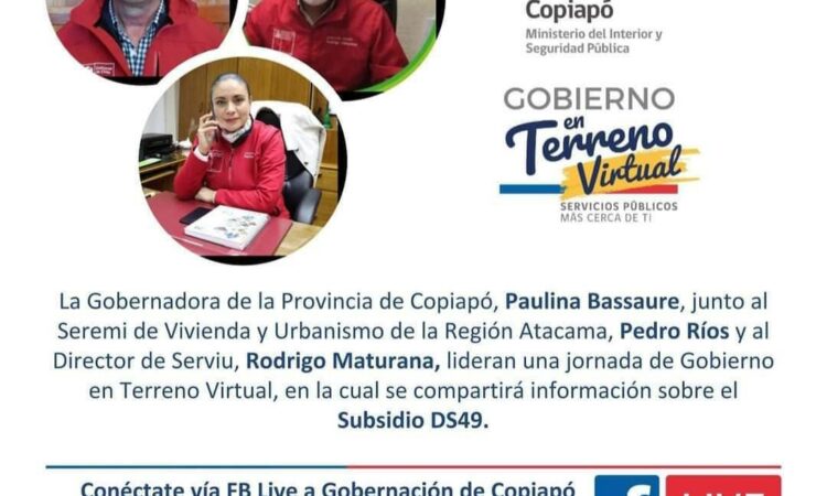 La Gobernadora de Copiapó Paulina Basaurre junto al Seremi de Vivienda y Urbanismo de Atacama Pedro Ríos y el Director del Serviu Rodrigo Maturana, realizarán una Jornada de Gobierno en Terreno con la finalidad de recibir las inquietudes de la ciudadanía en temas relacionados con vivienda, dicha Jornada será a través de Facebook Live este miércoles 23 de septiembre a las 18 horas, donde se compartirá información sobre subsidio DS49.